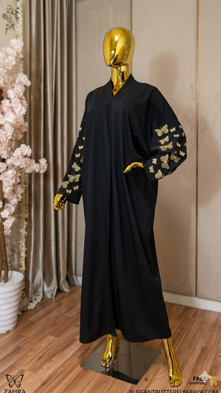 لكل وحدة تحب التميّز والهمّة، Liora تقدملك عباية "الفراشة" لي راح تزيد فيك النص. قماش طايح، خفيف، ومريح بزاف، مع هذيك اللمسة تاع الطرز الذهبي على اليدين لي تعطيها بريق خاص.